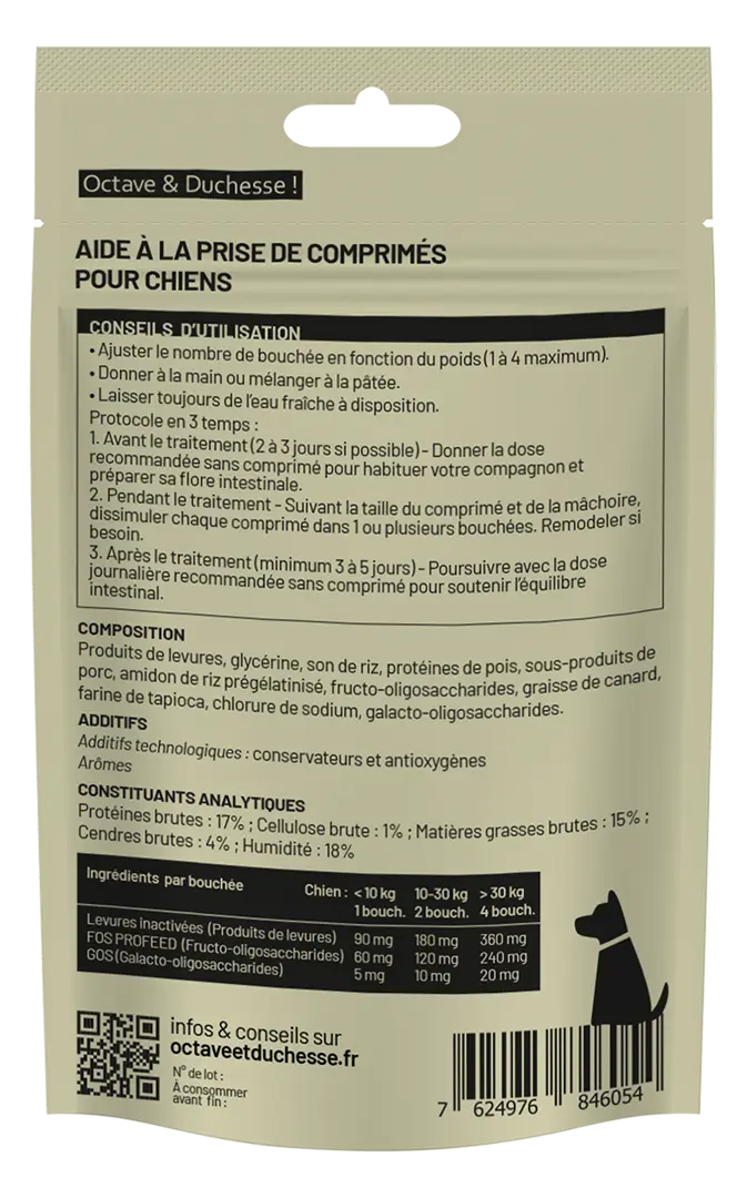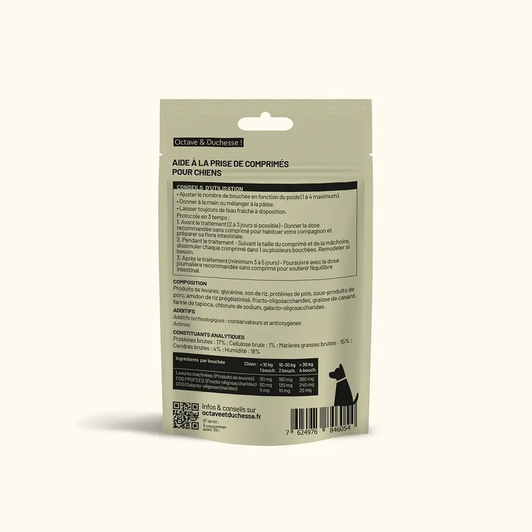 Un soft-chew conçu pour faciliter l’administration des médicaments aux chiens. Sa texture et son appétence permettent de dissimuler des traitements tels que les AINS, antibiotiques, vermifuges ou autres médicaments vétérinaires. En parallèle, il contribue au bien-être digestif grâce à des actifs sélectionnés pour leur effet bénéfique sur la flore intestinale et la digestion.