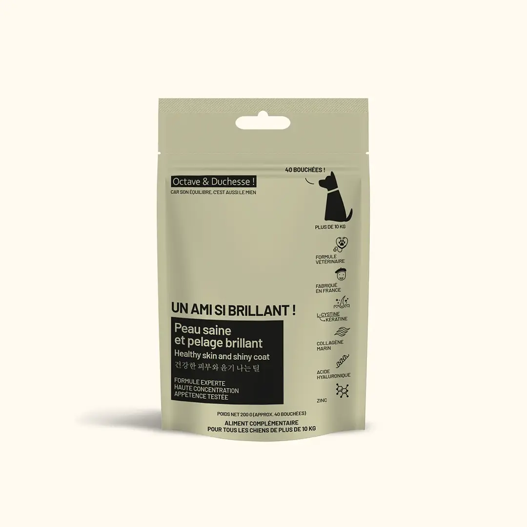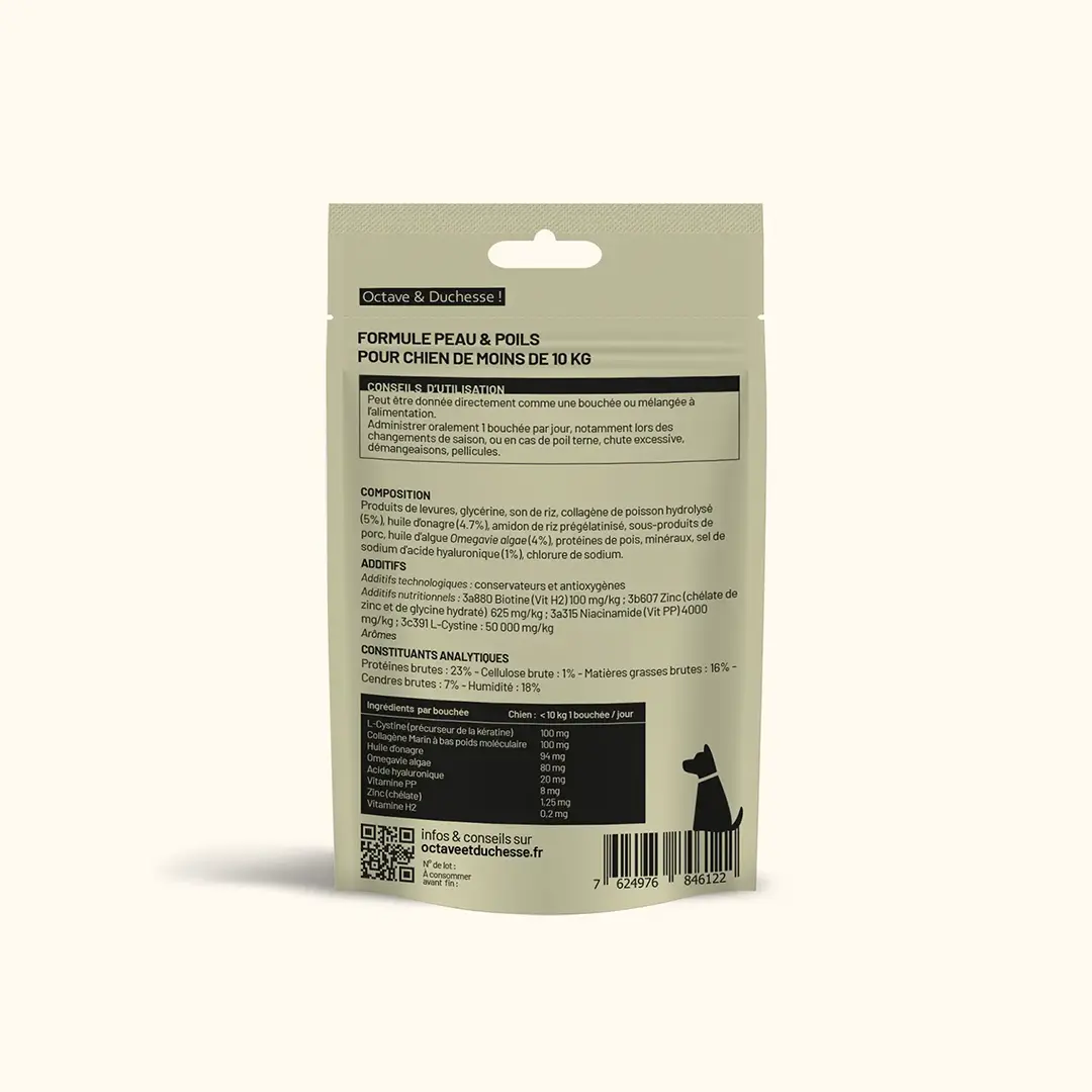 L’association collagène marin, L-cystine (précurseur de la kératine), acide hyaluronique, huiles riches en oméga 3 et 6, zinc et vitamines contribue à renforcer la barrière cutanée, limiter la chute de poils, soutenir la régénération cutanée et améliorer la qualité et la brillance du pelage.